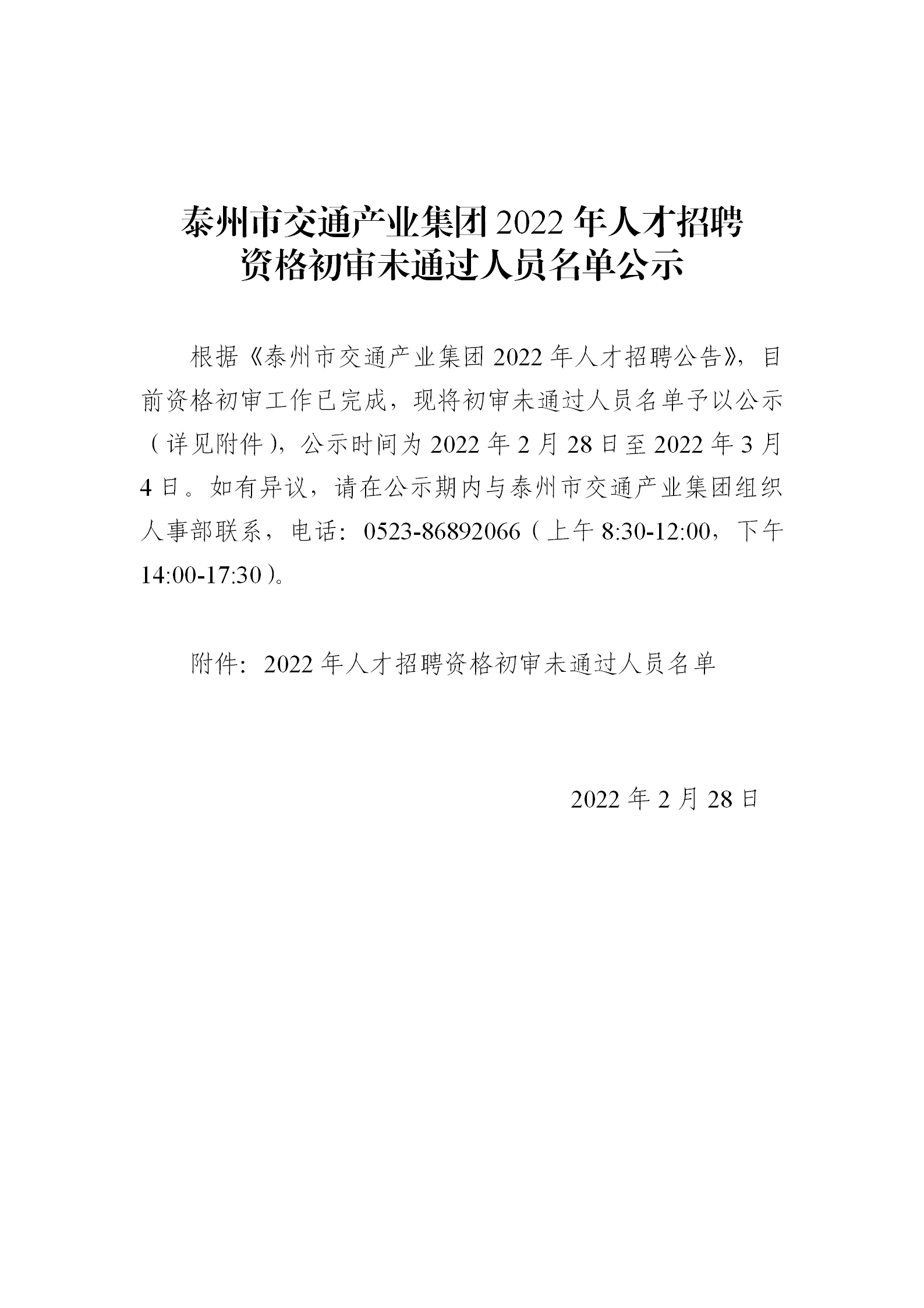 泰州市交通产业集团2022年人才招聘资格初审未通过人员名单公示