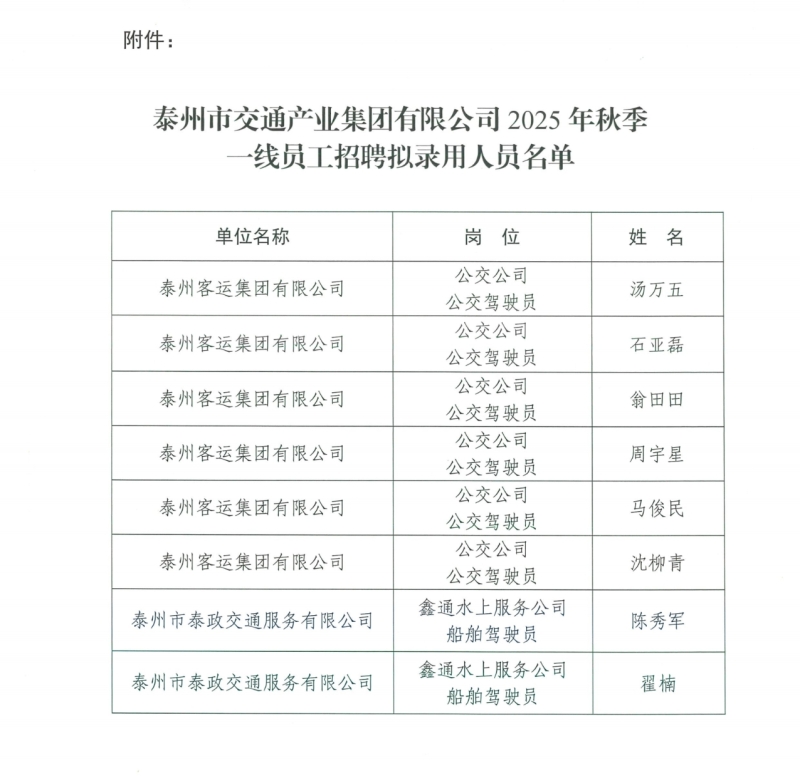 附件:泰州市交通产业集团有限公司2025年秋季一线员工招聘拟录用人员名单