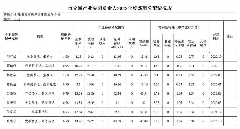 市交通产业集团负责人2022年度薪酬分配情况公示